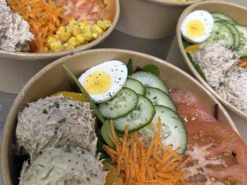 Slaatje Zalm: Gesnipperde gerookte zalm, kippewit, spek, sla tomaat, komkommer, cresson, pijnboom pitten.